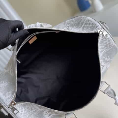 本款 Keepall BANDOULIÈRE 旅行袋取材 Damier Salt 帆布,采用路易威登成衣系列中用于丹宁布的做旧工艺处理经典涂层帆布,赋予大号格纹粗粝质感。充裕容量不负其名,适合周末度假或短途旅行。