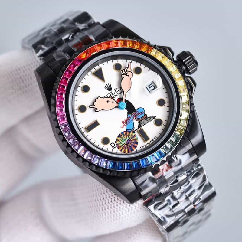 复刻一比一限量版,彩虹钻圈口!采用最高版本真逼镶工艺(轻微松动非胶水贴钻工艺)顶级手表品牌ROLEX , 表壳40mm!大力水手劳力士游艇,全精钢材质打造,Rolex Submarines (劳力士游艇系列)以及 Rolex Yachtmaster 两种表款改装并成新表款,表盘上更以两位卡通人物 Beetle Bailey 和 Popeye the Sailor (大力水手) 的双手作时针及分针,玩味十足﹗