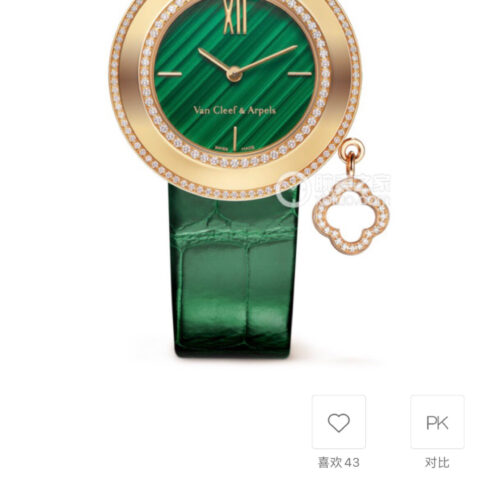 梵克雅宝CLEEF & ARPELS的设计特色 佩带后更显灵动美态。表壳一端的小环系上钻石幸运吊饰,调皮中显雍容,为华丽设计添上盎然生气。幸运吊饰可围绕表盘自由旋转,也可停留在特定位置,标示幸运时刻或珍贵时段,趣味与意义并重,不断提醒大家珍惜时间和人生。 尺寸:32MM 机芯:瑞士石英机 表镜:蓝宝石 表带:搭配鳄鱼皮 表壳:316精钢 表扣:针扣 表盘:天然孔雀石