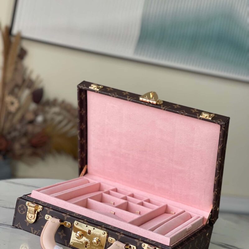 M20076粉色 这款 Monogram 珠宝箱尤其适合在旅行时用以携带珍贵物件。设有十三个大小不一的隔层,采用S锁配两个行李箱插锁开合。