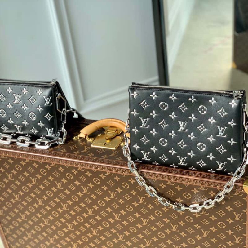 出自 Vuittamins 胶囊系列,为蓬松绵羊皮点缀粗犷链条,以鲜明色彩道出 Nicolas Ghesquière 对自信欢悦的解读。可利用肩带斜挎或作为链条法棍包,亦可携于腋下~