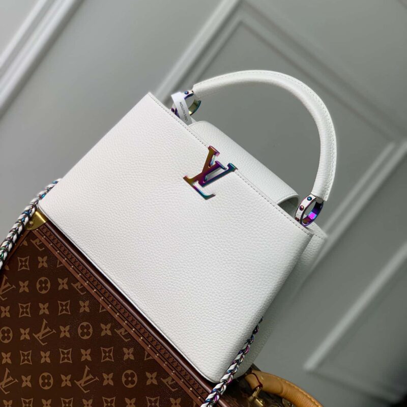 全皮cap那英款系列 CAPUCINES 中号手袋 本款 Capucines BB手袋为 LV 字母和编织链条赋予斑斓色彩,与 Taurillon 皮革包身的简雅格调互为反差。宛如珠宝的手柄环和铆钉延续莹润色泽,金属件再添明亮细节。详细特征厘米。31.5×20×11cm