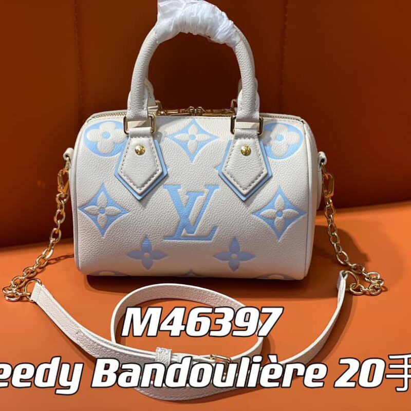 【原单精品】M46397蓝莓牛奶 全皮speedy枕头包系列 本款 Speedy Bandoulière 20 手袋出自崭新 Dégradé 系列,Monogram Empreinte 压纹皮革包身呈现缤纷色彩,为当季着装增添一抹亮色。辊压 Toron 手柄与可调节肩带实现肘挎肩背随心切换,成就都市生活与夏日聚会良伴。20.5 x 13.5 x 12.0 厘米 (长 x 高 x 宽)