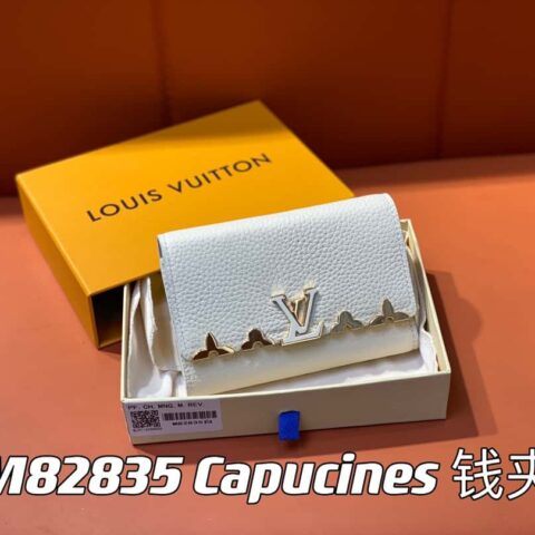 【原单精品】M82835白色 全皮三折钱包系列 Capucines 钱夹 M82764 82835 白色(花卉)兼具风格和实用性的“Portefeuille Capsine Compact”。Ms全粒柔软的三角皮革打造的小钱包,有8个卡槽,拉链零钱包,纸币口袋,2个平口袋。保护里面物品安全的LV字母的扣子型扣子也很有魅力。尺寸: 13.5 x 9.5 x 3 cm