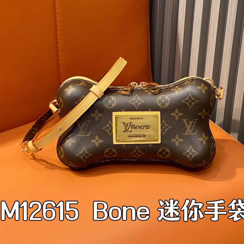 【原单精品】M12615老花 骨头包 BONE 迷你手袋 Bone 迷你手袋 选用 Monogram 涂层帆布,于内侧铭牌映现 Pharrell Williams 为上季系列设计的 LV Lovers 标识,再以萌掌印花注入盎然趣意。可拆卸并调节的肩带一面点缀 Monogram 图案,另一面铺陈细腻皮革。尺寸:14 x 6 x 24 厘米