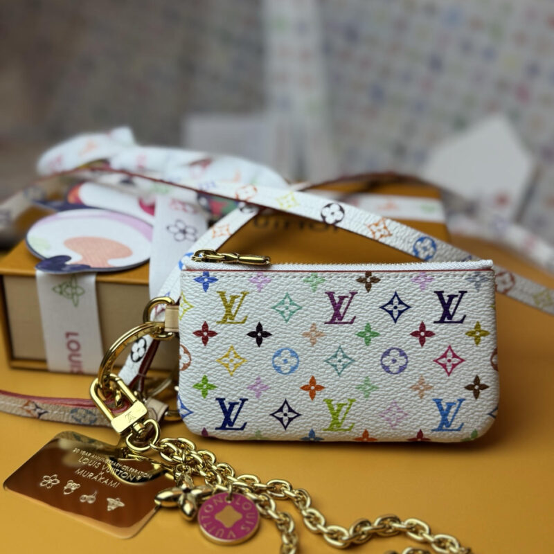 M14099 [官方全套包裝163芯片] 新品LVxTM 手机支架,这款充满活力的手机支架由路易威登与村上隆联名系列重新推出的限量版中活泼的彩虹色Monogram涂层帆布制成,重新诠释了路易威登的标志性标志与这位日本艺术家玩味的调色板。闪亮的金色五金配件增添了一丝时尚的金属质感,而一个拉链袋配件则为携带零钱和小件个人物品提供了实用的解决方案。12×6.5x1cm 《一级材料·智能工艺全钢五金·定律#(特级正品)二奢侈品》